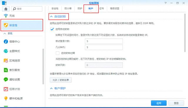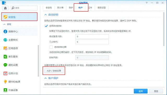 ÈçÏÂͼ¿ÉÒÔÉèÖÃʵÑéµÇ¼´ÎÊýʵʱ¼ä£¬£¬£¬£¬£¬£¬£¬£¬Áè¼Ý¾Í»á×Ô¶¯·â±Õ£¬£¬£¬£¬£¬£¬£¬£¬¸ÃÊý¾Ý°üÀ¨ËùÓÐͨ¹ý SSH¡¢Telnet¡¢rsync¡¢ÍøÂ籸·Ý¡¢¹²ÏíÎļþ¼Ðͬ²½¡¢FTP¡¢WebDAV¡¢Synology ÒÆ¶¯Ó¦ÓóÌÐò¡¢File Station »ò DSM µÄµÇ¼ʧ°ÜµÄ´ÎÊý¡£¡£¡£¡£¡£¡£¡£¡£